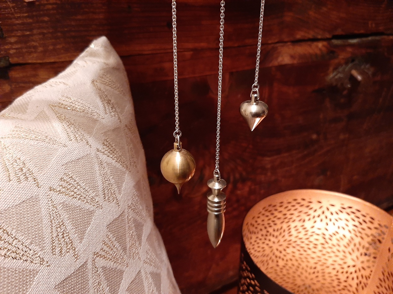 3) Pendule conique en maillechort avec chaînette en argent (à droite) – en rupture de stock